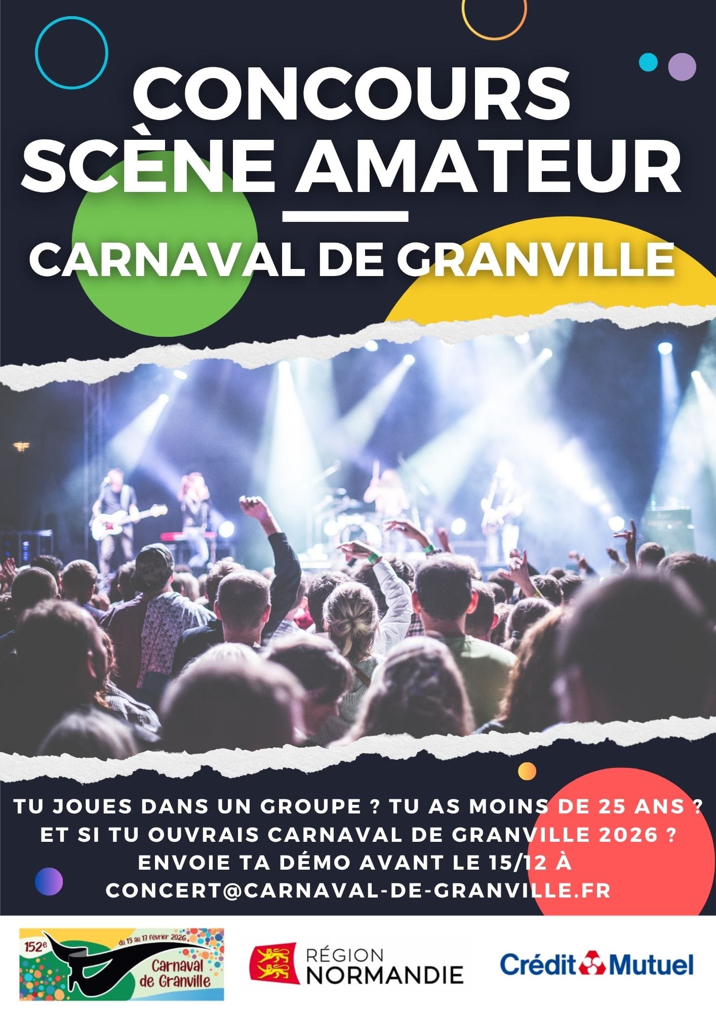 Alors, tu as moins de 25 ans, tu fais partie d’un groupe et tu veux ouvrir le 152ème Carnaval de Granville, le 13 février 2026, devant 3000 spectateurs ? Envoie ta démo avant le 15 décembre 2025 à concert@carnaval-de-granville.fr !